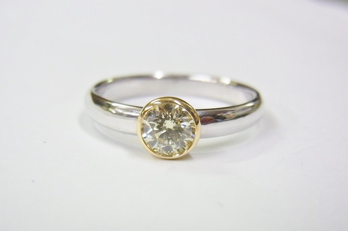 少しイエローが入ったラウンドカットのダイヤモンド。シンプルなリングにお仕立てさせて頂きました。