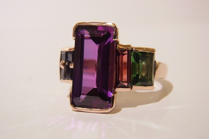 アメシストやガーネット、トルマリンなど色々なカラー・カットの宝石を使用してリングを作成しました。