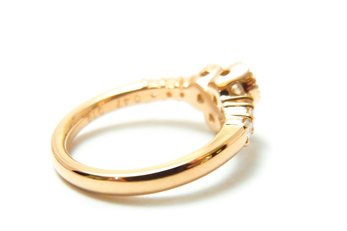 ミルグレインセッティングにも作り方が色々ありますが、当店が得意とするミル留めは、専用の工具を使用して一粒一粒手作業で地金を丸く仕立ててリモデルしていきます。石をセットしてから、石と地金のギリギリのところまでを強い力を加えて地金を丸くするには高い技術が必要になります。