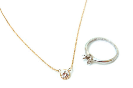 お客様がお持ちの立爪デザインのダイヤモンドリングを、ゴールドとプラチナのコンビネーションネックレスへジュエリーリメイクしました。