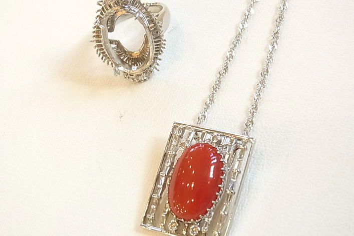 大粒のサンゴをテーパーカットダイヤで取り巻いたデザインのリングを、ペンダントにリフォームしたいとリクエストを頂きました。