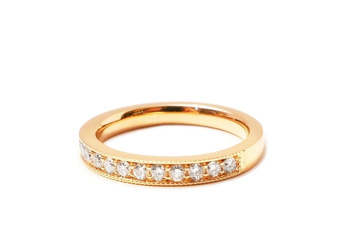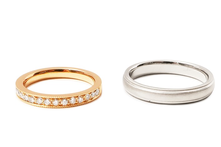 婚約指輪とおそろいの18金ピンクゴールドを使用し、デザインもそろえてきれいに重なるようお仕立てしました。