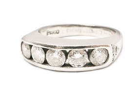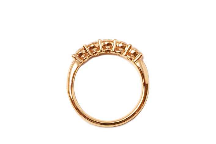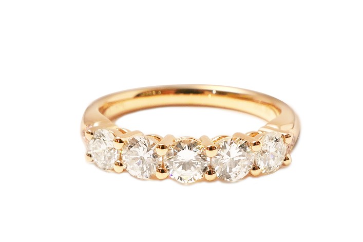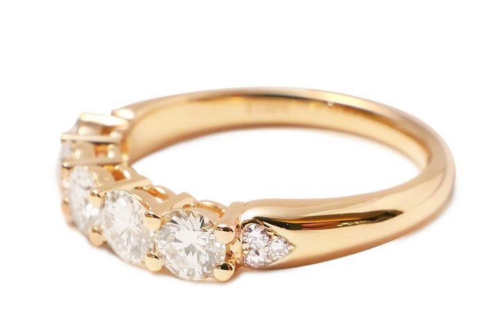 ダイヤモンドが5p、横一列にセットされた一文字リング。こちらのダイヤモンドを使用して、繊細な爪でセットしたハーフエタニティリングへジュエリーリフォームしました。