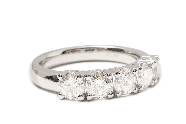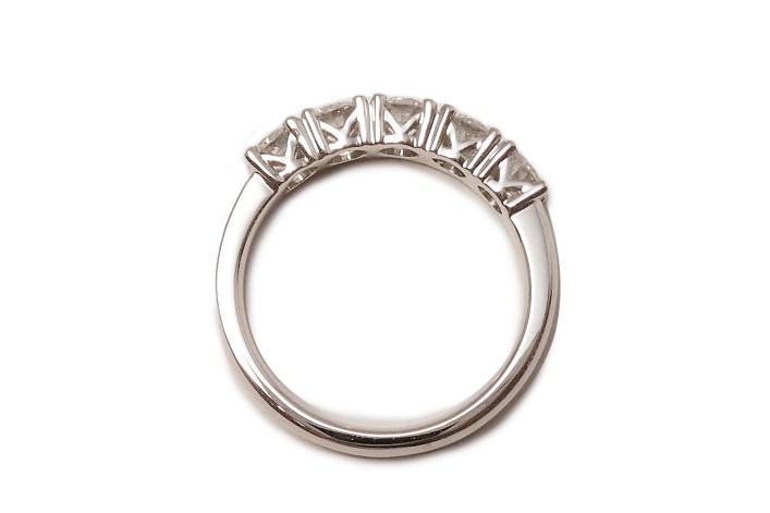 ラージサイズのダイヤモンドを5ピース使用して、横一列にセットしたハーフエタニティリングにジュエリーリフォームしました。