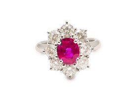 お客様がお持ちのルビーリングは、ルビーの周りに大きめなダイヤが1周セットされた華やかなリングです。
