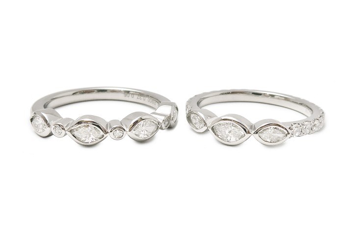 お客様がお持ちのマーキスカットダイヤモンドルースとダイヤモンドリングを使用して、2本のハーフエタニティリングへジュエリーリメイクしました。