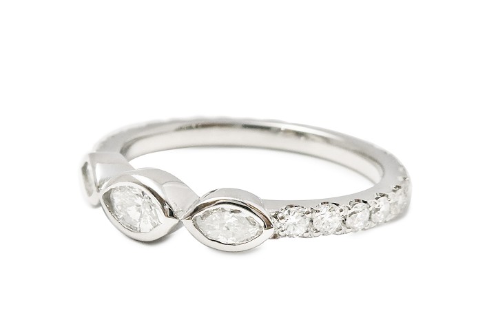 マーキスカットダイヤを横向きに配置してフクリン留めでセットしました。その間に小さいサイズのメレダイヤを挟みアクセントに。