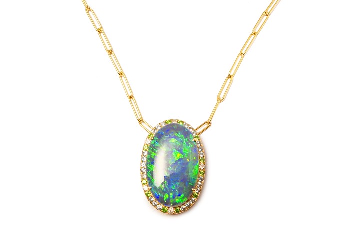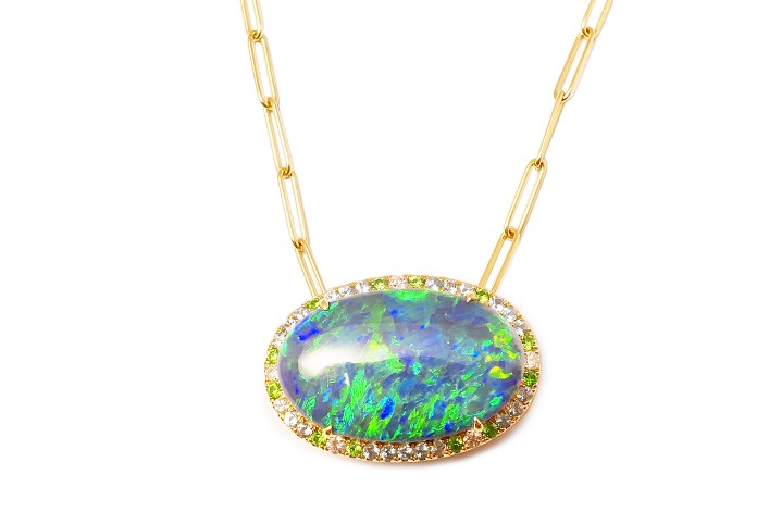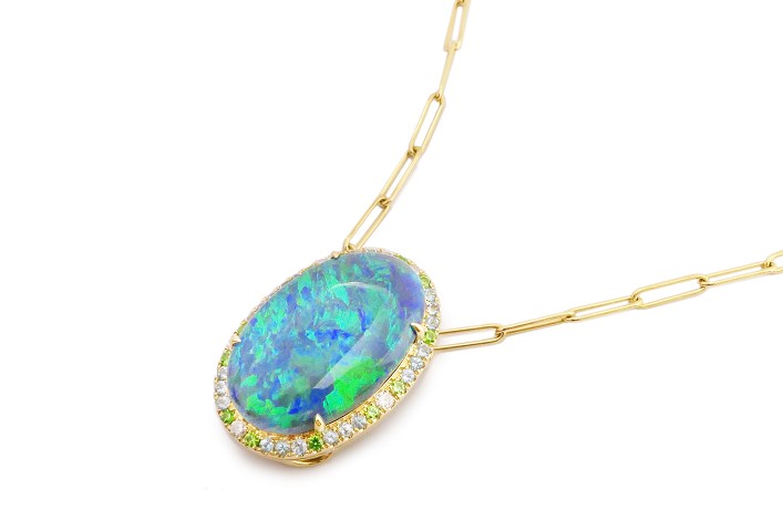 オパールの周りにメレダイヤとグリーンガーネットをランダムに1周セットして、オパールのブルーグリーンカラーを引き立たせました。