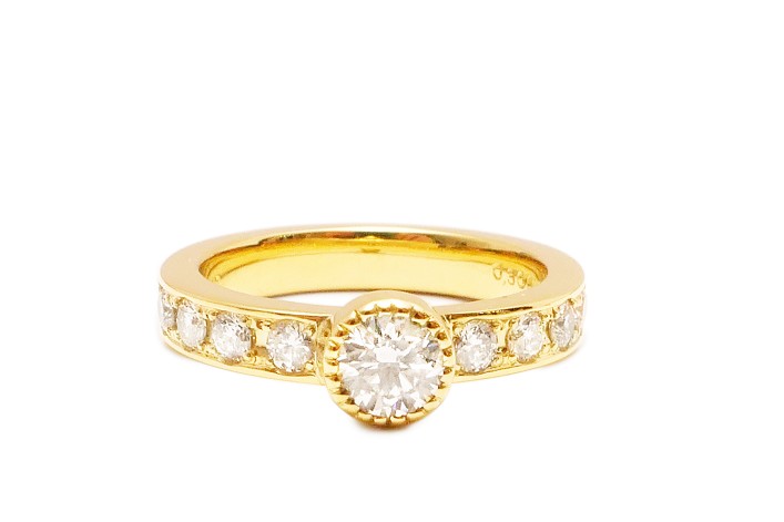 ミルグレインセッティングにも作り方が色々ありますが、当店が得意とするミル留めは、専用の工具を使用して一粒一粒手作業で地金を丸く仕立ててリモデルしていきます。石をセットしてから、石と地金のギリギリのところまでを強い力を加えて地金を丸くするには高い技術が必要になります。