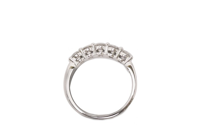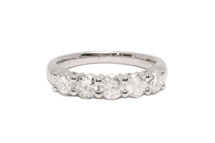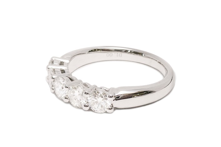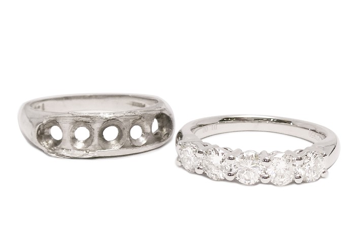 ダイヤモンドが5ピース、横一列にセットされたリングをお持ちのお客様。両脇を地金で挟んだデザインで、重厚感ある雰囲気です。このダイヤモンドを使用して、共有爪でセットされたハーフエタニティリングへジュエリーリフォームされることに。