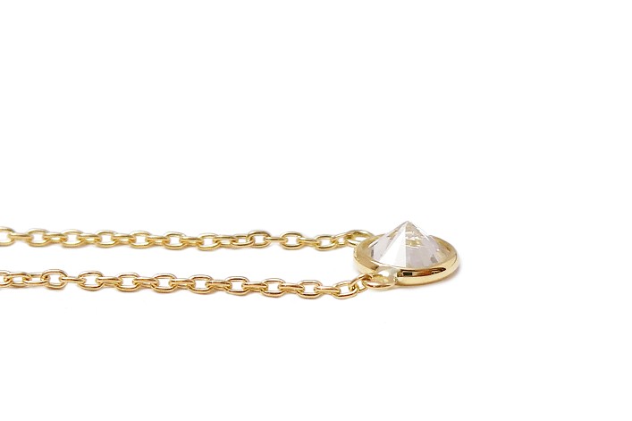 このダイヤモンドを使用して、縁を地金で覆うベゼルセッティングネックレスへジュエリーリフォームしました。ダイヤのとがった面が裸になっているのが特徴で、肌に触れるたびにコロコロと動き、キラリと輝いてくれます。