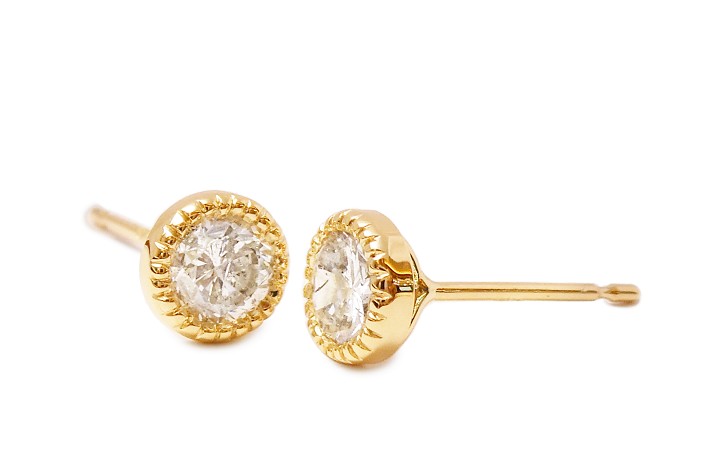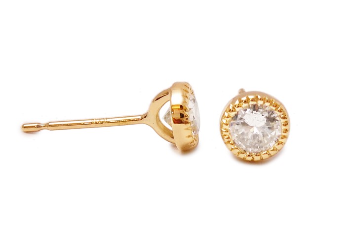 ミル留めの良いところは、爪留めと違い繊細な洋服等に引っかかることもなく、また華やかさを演出してくれるところです。