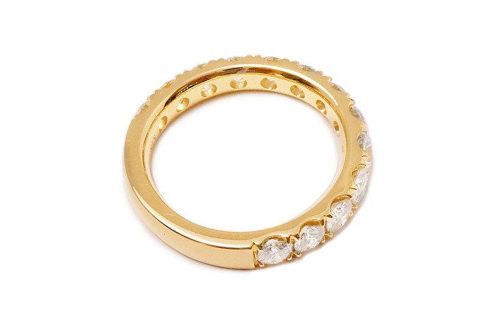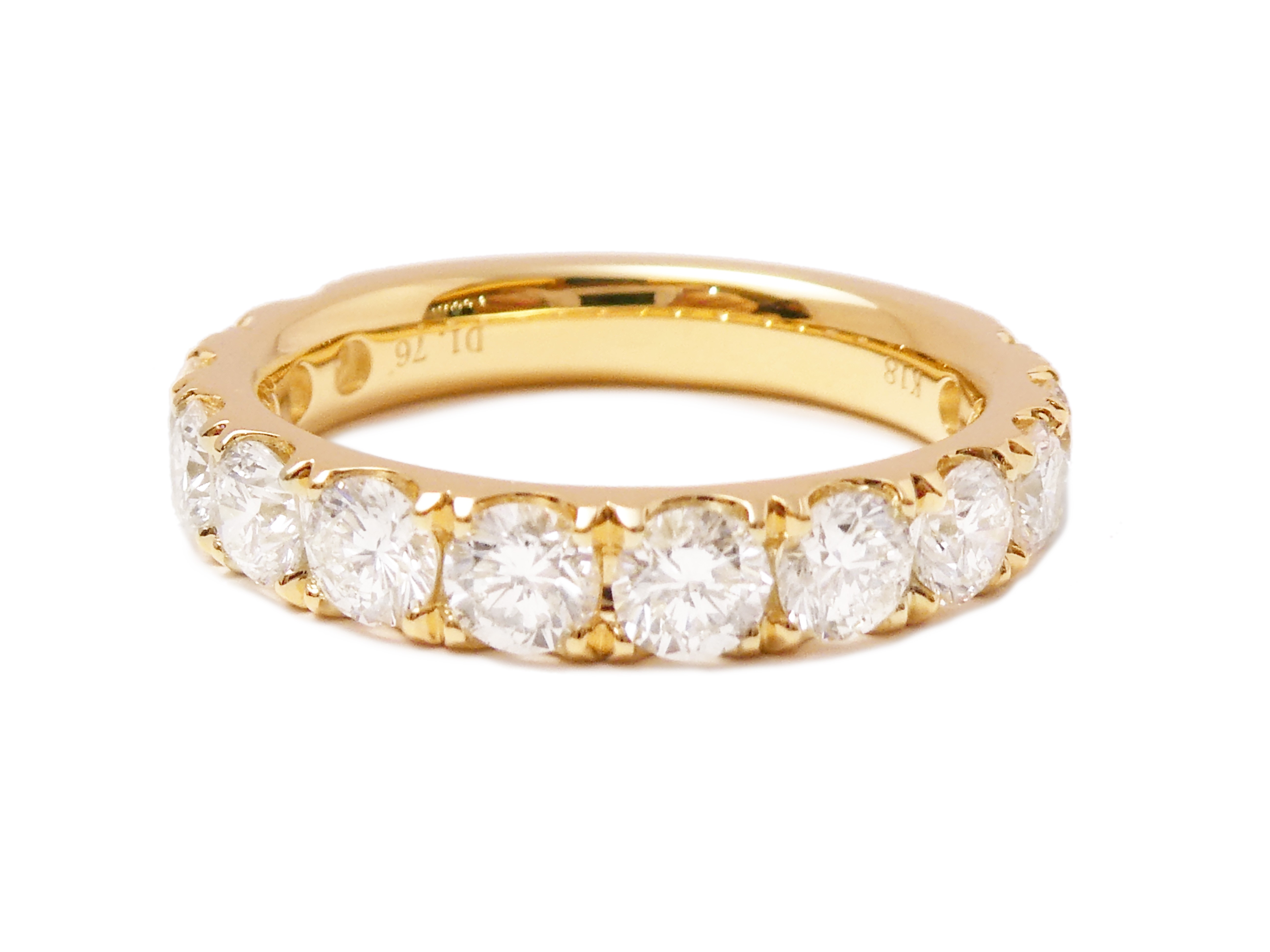 ダイヤモンドの幅に合わせてアームの厚みを持たせ、重厚感あるエタニティリングにお仕立てしました。リング内側は丁寧に磨いて指通りが良い仕立て上がりに。メレダイヤは埋め込むようにセットすることで繊細な洋服などに引っかかりにくくデイリーに身につけやすいアイテムに生まれ変わりました。