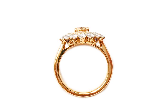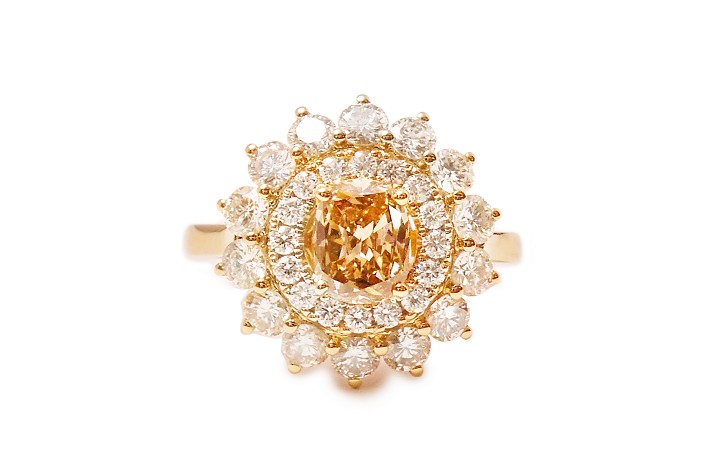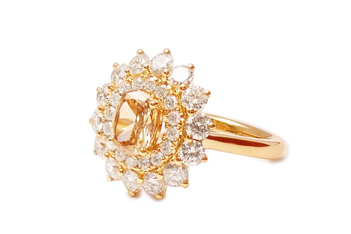 ブラウンダイヤはオーバルカットですが、全体的なフォルムは丸くされたいとのことで、組み立てを調整しながら丸く見えるように配置しました。外周のメレダイヤは爪を外側に設けて華やかな印象に。高さを押さえたいというご希望でなるべくフラットにデザインしました。CAD図を複数回調整して、お好みのイメージに仕立て上がりました。