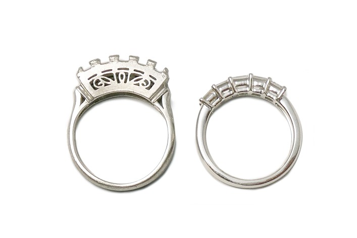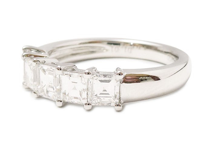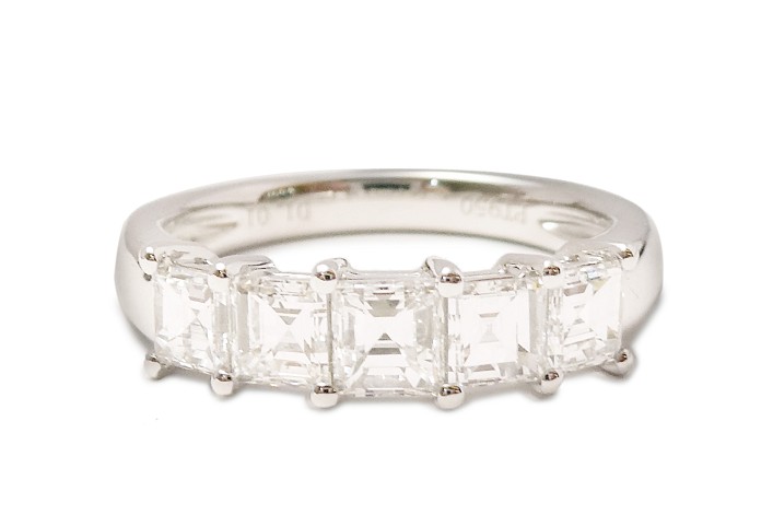 角ダイヤが5ピース、太目の爪でセットされた一文字リングをお持ちのお客様より、このダイヤモンドを使用してハーフエタニティリングへジュエリーリフォームのご相談を頂きました。一文字デザインリングとは、立爪デザインのダイヤモンドリングが婚約指輪の主流だった頃、それと重ねて身に付けるようにデザインされたリングです。立爪デザインと高さを合わせるように仕立てられていて、フォーマルな印象があり、最近では身に付けにくいとご相談を頂くことが多いデザインの一つです。