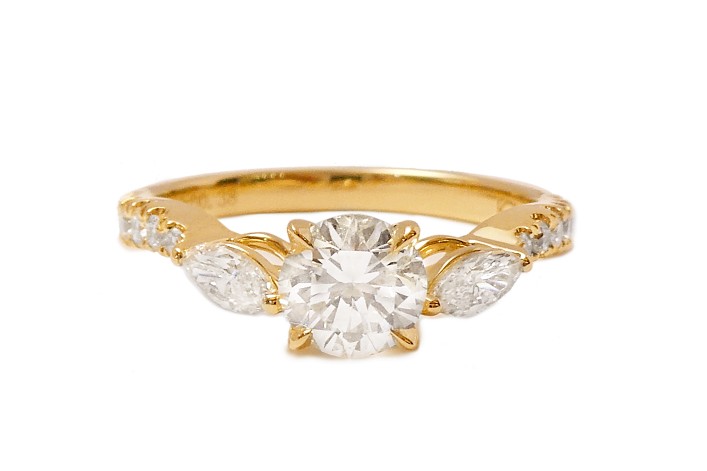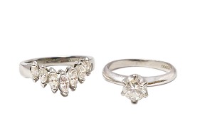 お客様がお持ちの2本のダイヤモンドリング。一粒デザインのダイヤモンドリングを、Vデザインリングと重ねて身につけられるデザインへジュエリーリフォームされることに。Vデザインのカーブラインや石座の高さと合わせるように作成しました。リングアームにVデザインリングにセットされているマーキスカットダイヤを用いて統一感を持たせました。今回かかったジュエリーリフォーム費用は305000円ですが、残ったリング枠をお引き取りさせていただきリーズナブルにジュエリーリフォームしていただきました。