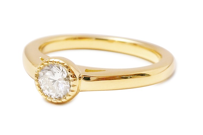 ミルグレインセッティングにも作り方が色々ありますが、当店が得意とするミル留めは、専用の工具を使用して一粒一粒手作業で地金を丸く仕立ててリモデルしていきます。石をセットしてから、石と地金のギリギリのところまでを強い力を加えて地金を丸くするには高い技術が必要になります。