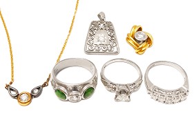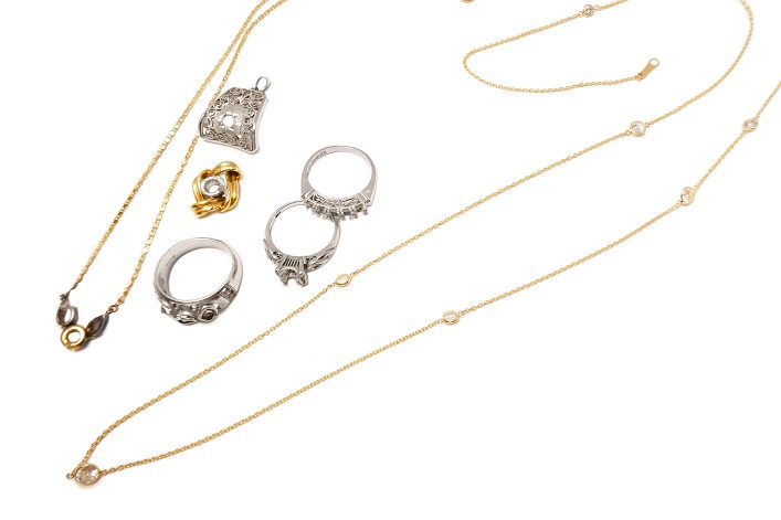 お客様がお持ちのダイヤモンドがセットされたジュエリー。これらのダイヤモンドを使用して、ステーションネックレスへジュエリーリフォームしました。
