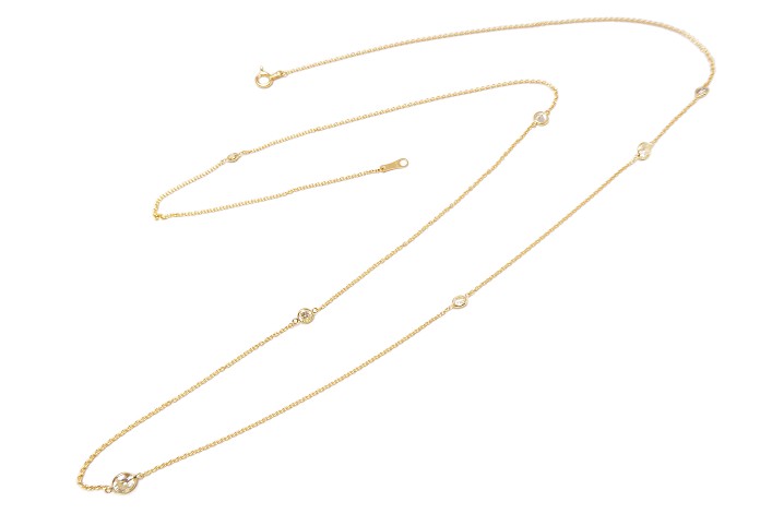 綺麗で大きさがあり、それらがそろった7ピースを選んで、18金の70cmチェーンにアシンメトリーになるよう配置しました。ダイヤモンドの縁を地金で巻くことで、ダイヤの裏面を裸にして、ひっくり返ってもキラリと輝くようにセットしました。今回かかったジュエリーリフォーム費用は226000円ですが、残ったジュエリーをお引き取りさせていただきリーズナブルにジュエリーリフォームしていただきました。