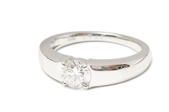 アーム幅をダイヤの直径くらいにして目立たない4本の爪でセットしました。アームに厚みを持たせることで、ダイヤの高さを感じさせない作りになっています。今回かかったジュエリーリフォーム費用は155000円ですが、残ったリング枠をお引き取りさせていただきリーズナブルにジュエリーリフォームしていただきました。