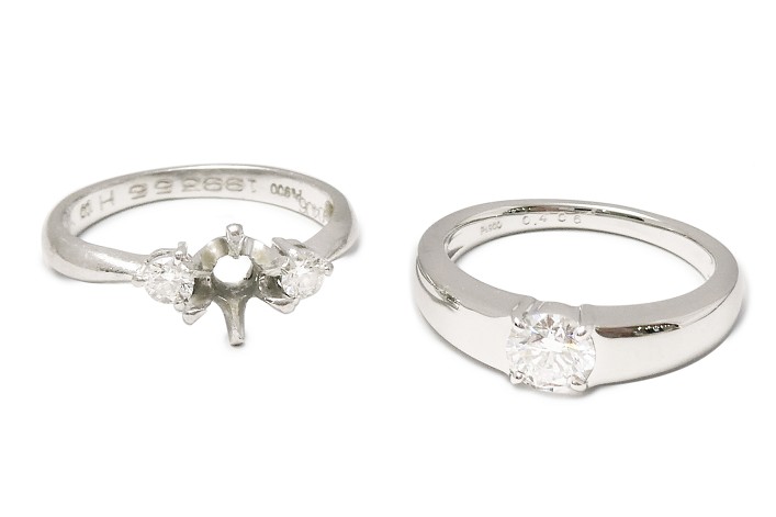 6本の爪でセットされたフォーマルな印象のダイヤモンドリングを、フラットでカジュアルに身につけやすいデザインリングへジュエリーリフォームしました。