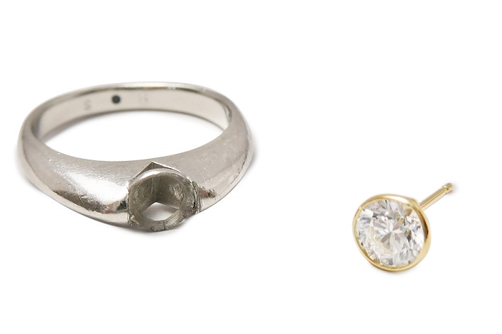 お客様がお持ちのダイヤモンドリングを、ベゼルセッティングデザインのシングルピアスへジュエリーリフォームしました。
