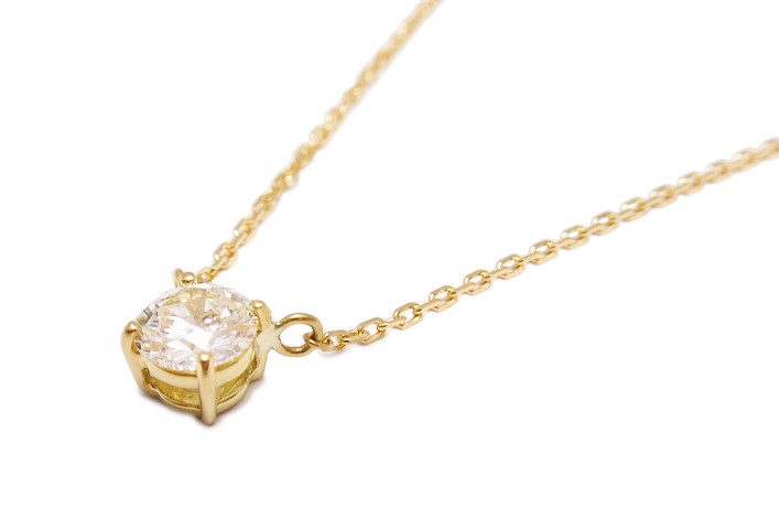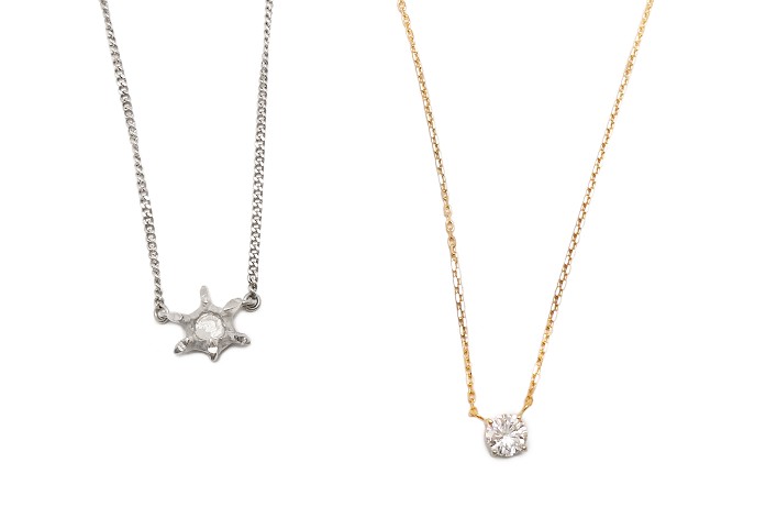 6本の爪でセットされたダイヤモンドネックレスをお持ちのお客様。爪がやや太く、プラチナチェーンもやや太めで普段身につけにくいとご相談いただきました。そこで、地金の素材をプラチナから18金イエローゴールドに変えて、チェーンも細めの小豆チェーンに取り替えました。ダイヤの留め方は繊細な4本の爪でセットして、雰囲気が大きく変わりました。今回かかったジュエリーリフォーム費用はチェーン代含めて120,000円ですが、残ったネックレスをお引き取りさせていただきリーズナブルにジュエリーリフォームしていただきました。
