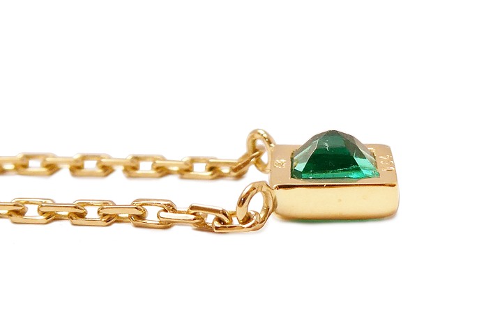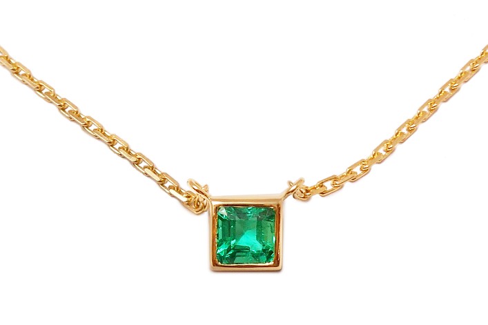 お客様がお持ちのエメラルドリングを、石の縁を地金で覆うベゼルセッティングデザインネックレスへジュエリーリフォームしました。