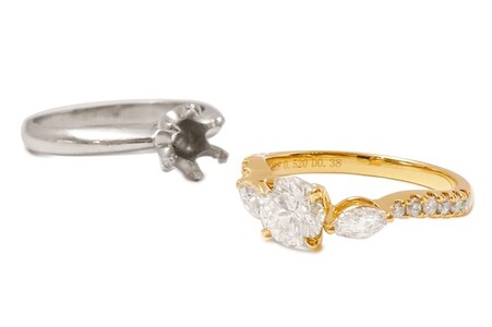 お客様がお持ちのマーキスカットダイヤモンドルースとダイヤモンドリングを使用して、2本のハーフエタニティリングへジュエリーリメイクしました。