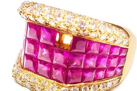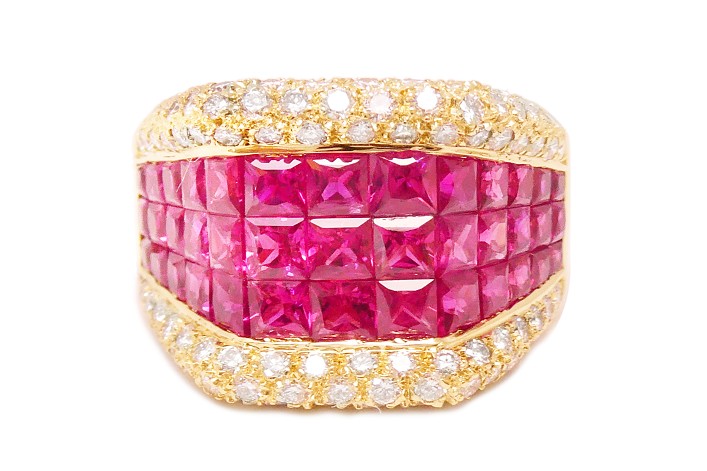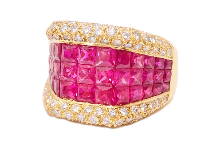 四角くカットされたルビーが隙間なく爪を使わずにセッティングされています。